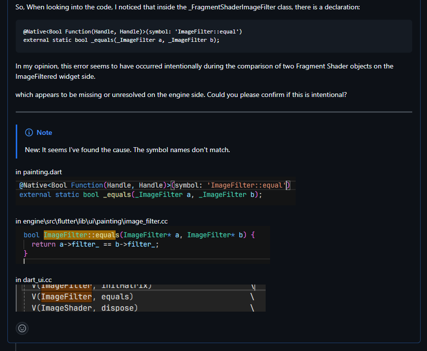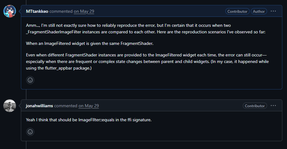 저는 ImageFilter 쪽에서 인터페이스 불일치 문제가 발생하는 것을 어렴풋이 알았고, 이와 관련하여 자세히 분석하고 해당 사실을 플러터 개발자들과 공유하였습니다. (매우 뿌듯)