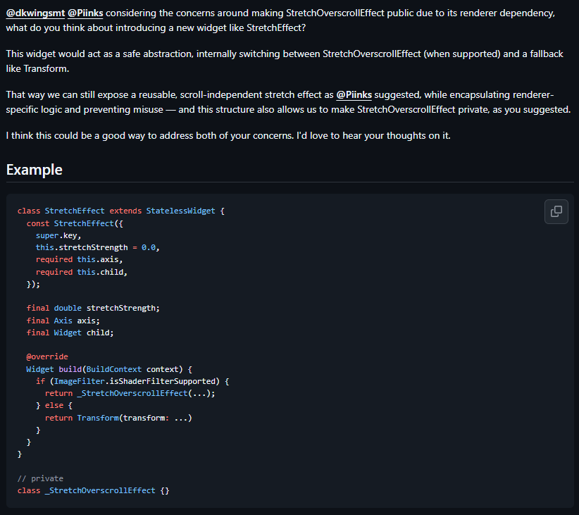 초반에는 이 방향이 타당해 보였지만, 솔직히 저는 커스터마이징을 매우 자주하고 심지어 기존 플러터 효과도 재구현을 자주 하기에 많이 아쉬웠습니다. 솔직히 리뷰어가 제안한 방법은 기존 커스터마이징에 매우 친화적인 플러터 방향성과는 맞지 않아 보였거든요. 그래서 저는 단순히 리뷰 의견을 수용하지 않고 한가지 대안을 리뷰어에게 제안했습니다.